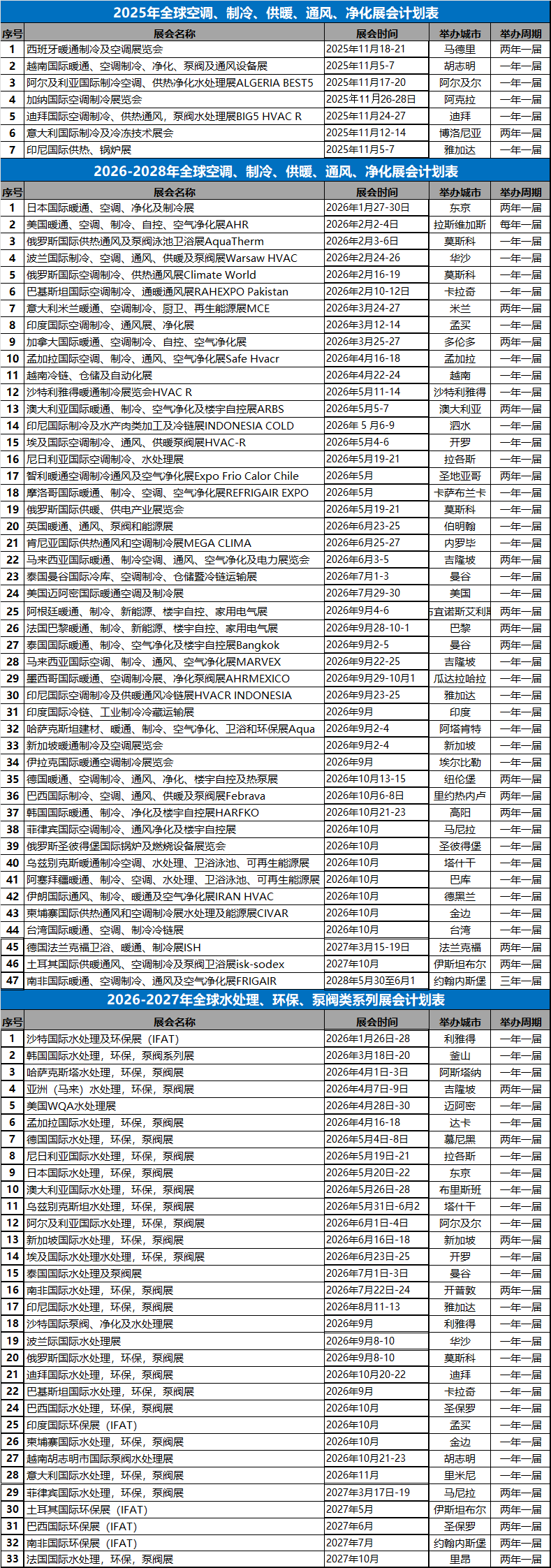 **2025-2028年全球空调制冷、供暖通风净化及水处理、泵阀、环保展会计划表